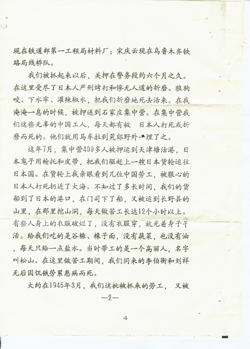 我们被抓起来以后,关押在警务段约六个月之久。在这里受尽了日本人严刑拷打和惨无人道的折磨。狼狗咬、下水牢、灌辣椒水,把我们折磨地死去活来。在我[奄奄]一息的时候,被押送到石家庄集中营。在集中营我们这些无辜的中国工人,每天都有被日本人打死或折磨而死的。他们就用马车拉到荒郊野外一埋了之。