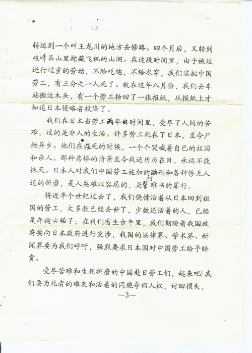 将近半个世纪过去了,我们侥[幸]活着从日本回到祖国的劳工,大多数已经去世了,少数还活着的人,已经是年逾古稀了。在我们有生余年里,我们期盼着我国政府要向日本政府进行交涉,我国的法律界、学术界、新闻界要为我们呼吁,强烈要求日本国对中国劳工给予赔偿。
