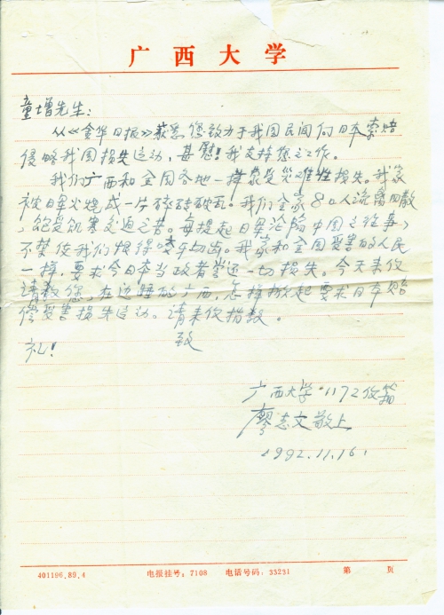 我们广西和全国各地一样蒙受灾难性损失。我家被日军火烧成一片碎砖破瓦。我们全家8口人流离四散,饱受饥寒交迫之苦。每提起日军沦陷中国之往事,不禁使我们恨得咬牙切齿。我家和全国受害的人民一样,要求今日本当政者[偿]还一切损失。今天来信请教您,在边陲的广西,怎样掀起要求日本赔偿受害损失运动。请来信指教。