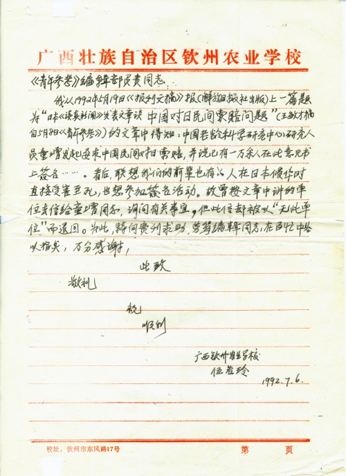 细节:我看到《报刊文摘》上提到您发起对日索赔,我想参加签名活动。