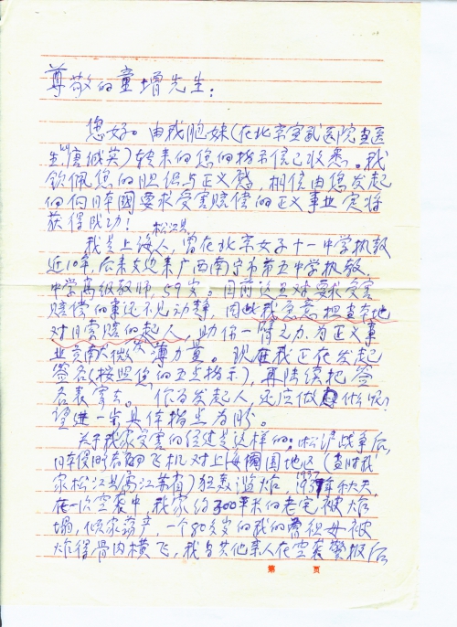 由我胞妹(在北京宣武医院当医生,叫唐诚英)转来的您的指示信已收悉。我钦佩您的胆识与正义感,相信由您发起的向日本国要求受害赔偿的正义事业定将获得成功!