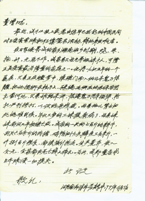 在日军侵略我的家乡湖南淞乡时期,烧、杀、抢、奸,无恶不作。我家有父母兄弟姐妹十人,可惜正是受害最为惨重的家庭之一。记得一九四五年的一个夏夜,父亲正在睡梦中,被破门而入的日本鬼子惊醒,把他捆绑在柱子上,硬逼迫供出地方保安团扎营何处,父亲始终未讲,恼得鬼子用手榴弹,枪托严刑拷打,以致终身残疾。母亲拖儿背女四处逃难成疾。年仅三岁的三妹被磨病了,母亲妹妹都没几年相继亡故。我家的一头约七百斤的耕牛,两头六百余斤的肉猪,鸡鸭四十九只,鲜鱼三百来斤,一千八百斤粮食,都被强行抢走。生产荒弃,收入全无,全家都在死亡线上挣扎。为此,我郑重要求日本赔偿一切损失。
