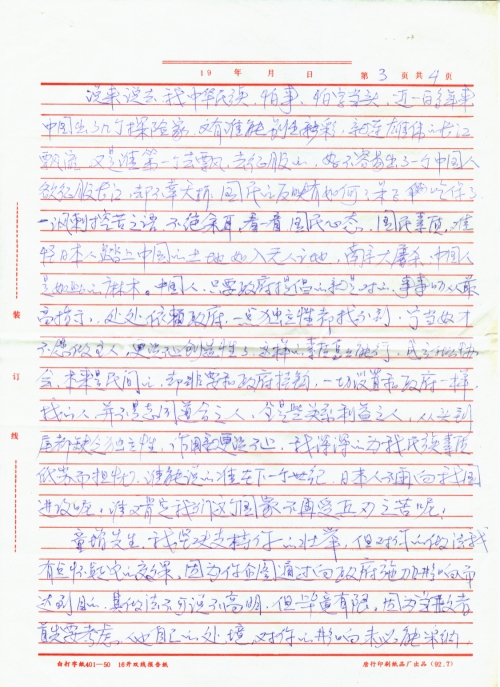 童增先生,我坚决支持你的壮举,但对你的做法我有点怀疑它的效果,因为你企图通过向政府施加影响而达到目的。其做法不可说不高明,但毕竟有限,因为当政者首先要考虑他自己的处境,对你的影响未必能采纳,不要迷信于他们,希望你能联合广大的民众,组成一个专门的民间组织,这样你的理想才能尽快的实现。单枪匹马只能不了了[之],假如你有心致力这件事,我首先加入你的行[列],为争取民族的利益奔起呼号,不惜献上我五尺之躯,是时候了,我中华民族应该敢说敢干,我们应该得到的,我们决不放弃,我们决不怕事,我们身后有十一万万同胞,我们怕什么?如果我年轻人都不敢做事,我们民族离灭亡就不远了。为了振兴我中华民族,我们应该携起手来,共同努力。