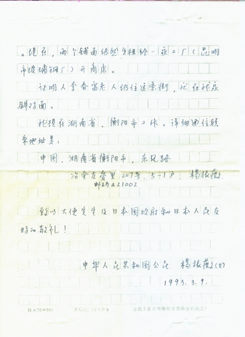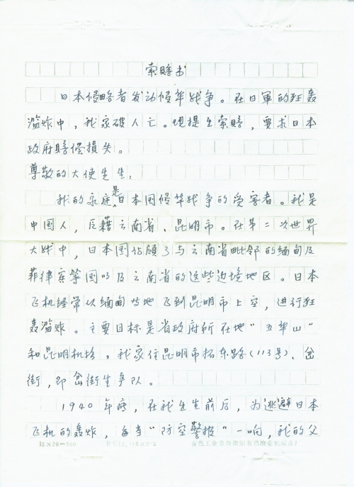 现在,我为自己,并代表我的家庭(包括在这场战争中死去的祖母),向日本政府提出索赔,要求给予受害赔偿。这符合国际惯例,也有利于中日两国人民的长期友好。请大使先生向贵国政府转交我的“索赔书”,并给予答复为盼!希望得到日本政府合情合理的解决。
