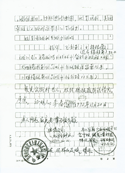 我是岔街村老人:根据杨振薇所说情况,属实。证明人:李春富(人名章)
