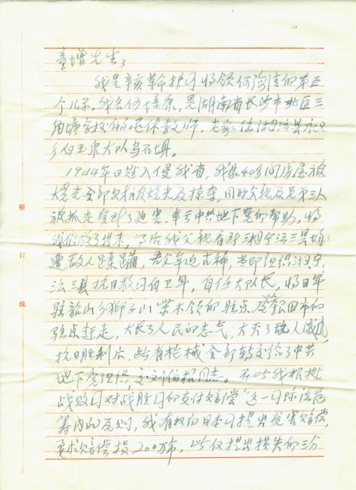 1944年日寇入侵我省,我家40多间房屋被烧光,全部财[产]被烧光及掠夺。同时,父亲及兄弟三人被抓走受到了迫害,幸亏中共地下党的帮助,将我们救了出来。事后我父亲看到湘宁潭三县均遭敌人蹂躏,吾父年近古稀,当即组织湘宁潭三县抗日救国自卫军,自任大队长,将日军驻韶山乡狮子山柴木岭的驻点及从银田市的驻点赶走,大长了人民的志气,大灭了敌人威风。抗日胜利后,所有枪械全部转交给了中共地下党组织交刘伯根同志。在此我根据战败国对战胜国的支付赔偿这一国际法范[畴]内的原则,我有权向日本国提出受害赔偿,要求赔偿损[失]200万人民币,此仅提出损失的三分之一左右。今特函委托将我家的损失提出对日索赔的要求,事成感谢。