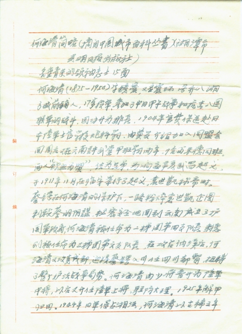 我是辛亥革命护国将领何海清的第五个儿子。我名何培康,是湖南省长沙市北区三角塘学校的退休教师,老家住湘潭县永义乡白玉泉大队乌石坝。