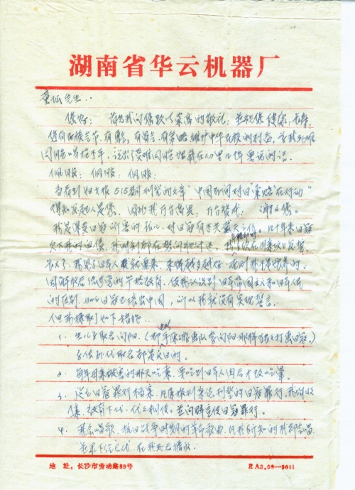 I grew up as an orphan and a victim of the Japanese army. I have a profound hatred of the Japanese army and I am so ready to claim for compensation against them for decades. When I was young, I swore before my mother’s tomb for many times that when I grew up, I would kill every Japanese people I encounter, the more the better, otherwise I am not her son. But after the People’s Liberation, I’ve realized the difference between Japanese imperialism and the Japanese people through the (Communist) Party’s education. Besides, the Japanese army was kicked out of China, so I didn’t keep my promise. But I’ve taken the following measures: