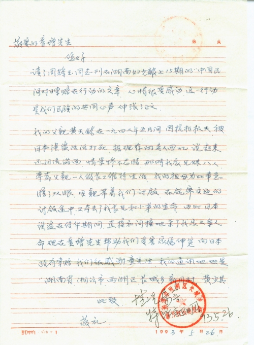 我的父亲黄天锡在一九四二年五月间,因抗拒抓夫被日本强盗活活打死,据现存的老人回忆说起来还泪流满面,情景惨不忍睹,那时我家兄妹八人专靠父亲一人做长工维持生活,我的祖母为此事急瞎了双眼,母亲带着我们讨饭,在饥寒交迫的讨饭途中,又夺去了我长兄和小弟的生命,由此日本强盗在侵华期间,直接和间接地杀了我家三条人命,现在童增先生帮助我们受害家属伸冤向日本政府索赔,我们很感谢童先生,我的通讯地址是:湖南省湘沄市西湖区长城乡,新月村。黄少其