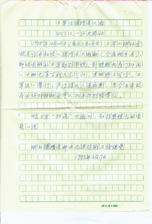 1938年4月20日(农历三月十二日)日军从浙江余杭县临平镇侵入德清县大麻镇(今属桐乡县),即被凶残的日军劫掠焚烧,计烧毁民房734间,大批无辜百姓无家可归,其状惨不可言。日军这一暴行,严重违反人道原则,当今日本政府必须对该镇受害人民承担赔偿责任。