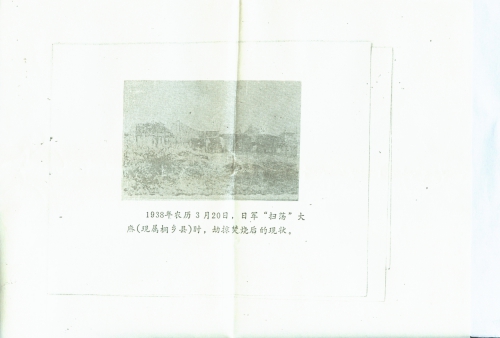 细节:1938年4月20日日军从浙江省余杭县入侵德清县,烧毁民房734间。大批百姓无家可归,日本必须对受害人赔偿。随信寄来被烧后的照片复印件一张。