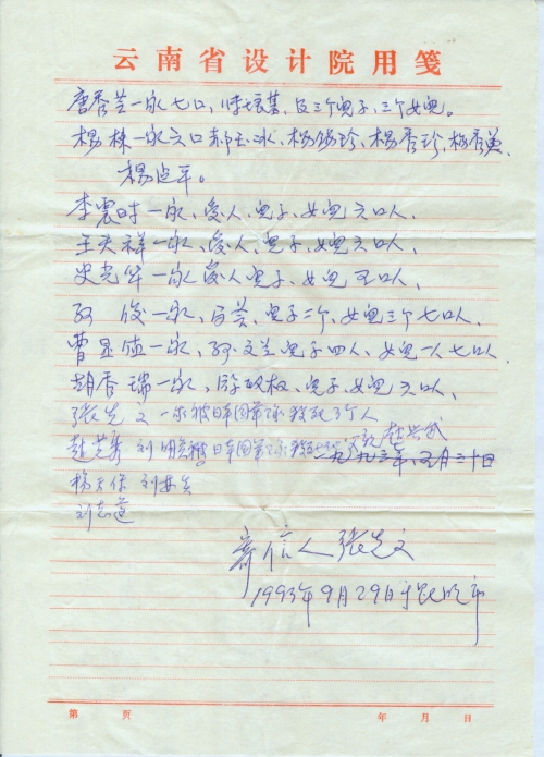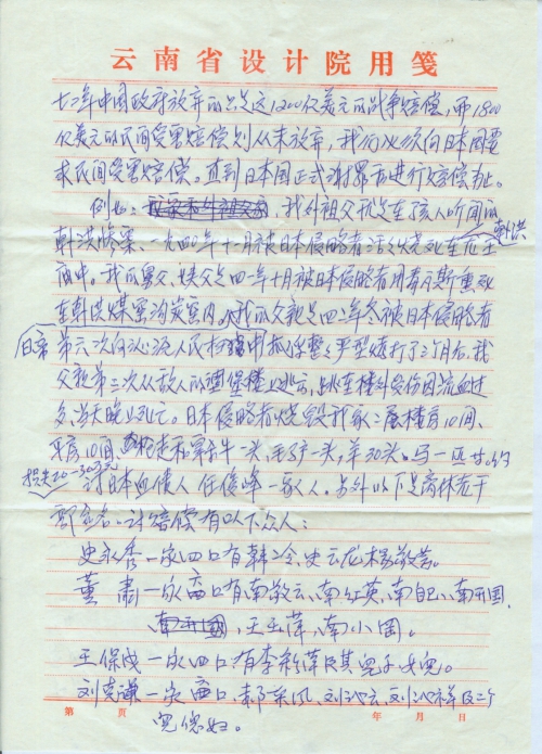 例如:我外祖父就是在骇人听闻的韩洪惨案,一九四〇年十一月被日本侵略者活活烧死在韩红龙王庙中。我的舅父、姨父是四一年十月被日本侵略者用毒瓦斯熏死在韩洪煤窑沟炭窑内。日帝第六次向泌源人民扫荡中,我的父亲是四二年冬被日本侵略者抓俘整整严[刑]拷打了三个月后,我父亲第三次从敌人的[碉]堡楼上逃出,跳在楼外受伤因流血过多,当天晚上死亡。日本侵略者烧毁我家二层楼房10间、平房10间,[抢]走和宰杀牛一头、毛驴一头,羊30头,马一匹等。约损失20-30万元,讨日本血债人任俊峰一家人。另外以下是离休老干部签名。讨赔偿有以下众人:
