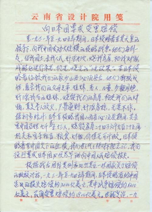 Japan led by its Emperor launched a massive war of aggression against China between 1931 and 1945. The invading Japanese army occupied our land wherever they went, killed our people, raped women, burned our houses and robbed our property by implementing the Three Alls policy. After occupying my hometown Qinyuan, Shanxi, the Japanese invaders killed the villagers, raped women, burned houses and robbed our property. There were corpses everywhere. According to preliminary statistics, during their period of occupying Qinyuan, Shanxi, the Japanese army killed 9,153 Chinese people, burned down 246,935 houses and robbed and killed livestock, food and property, the value of which is immeasurable. We and the generations to come will never forget the debt that Japanese invaders owe to us and we strongly demand Japan to compensate the Chinese people for their losses as soon as possible.