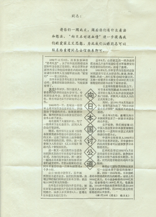 Meanwhile, since August 1991, Tong Zeng, etc. have launched a massive signature campaign of “demanding damage compensation against Japan”.