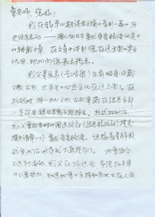 我父是画家(李鸿梁)生前酷爱收藏文物、古书,大半生的心血全花在这上面了。在抗战时,将一批文物、古书寄藏在绍兴市郊一寺院里,被日本鬼子抢掠去。抗战胜利后,我父曾向当时的国民政府(绍兴县政府)提交损失清单一份,要求受害赔偿。但接着是解放战争,以后此时就不再提起了。此事距今已近半个世纪。我父亲在71年过世,寺院在文革中已遭破坏,知道此事的住持和尚也不在人间。当时我又年纪小,今年我60岁,从6、7岁开始我就逃难了,所以到底损失多少东西,我无记忆。