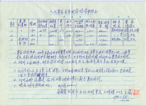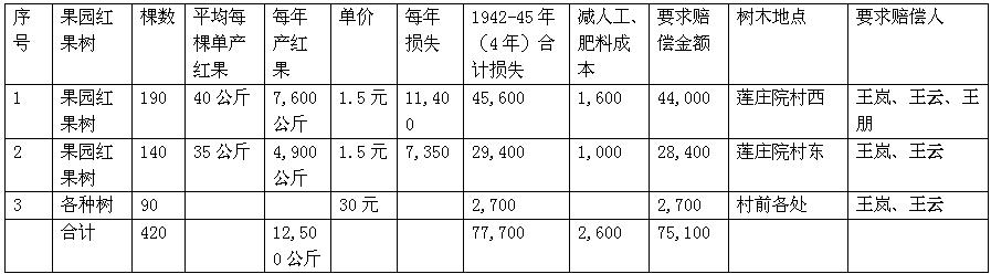 1.要求赔偿理由:1942年日本侵略中国冀东时期,在我们村附近,日军与抗日八路军打了一仗,八路军走后,日本人将我村中各种树木,全部砍光,大木料拉走修炮楼,使我村人民遭受很大损失。