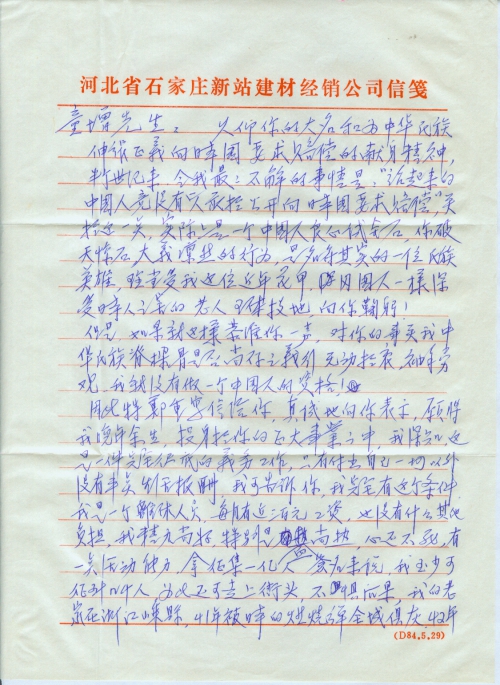 因此特郑重写信给你,真诚地向你表示,愿将我晚年余生,投身于你的正大事业之中,我深知这是一件完全彻底的义务工作,只有付出自己一切以外没有半点生活报酬,我可告诉你,我完全有这个条件,我是一个离休人员,每月有近三百元工资,也没有什么其他负担,我精力尚好,特别是血尚热,心还不死,有一点活动能力,拿征集一亿人签名来说,我至少可征到几千人,为此还可走上街头,不惧后果,我的老家在这浙江嵊县,41年被日本的燃烧弹全城俱灰。42年日本军进驻后,听老人说发生过慰安妇事情,(地点在长乐镇)如果你要我做什么我都可以毫无条件尽自己之一切,听说你忙得很,这何以想见的,你如果需要我,也可以跑腿,干什,除了为我弄到一张床以外,一切相关费用都可以自理。(当然,床位的租费也由我付)。