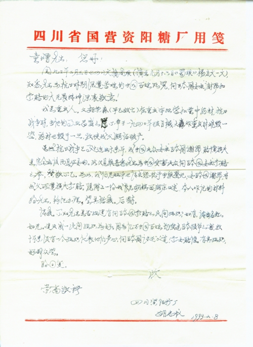 阅九三年二月三日《四川文摘周报(摘至九月十六日《蜀报》杨力文一文),知悉先生为抗日时期深遭苦难的中国百姓鸣冤,向日本国提出了谢罪和索赔的大无畏精神深表敬意!
