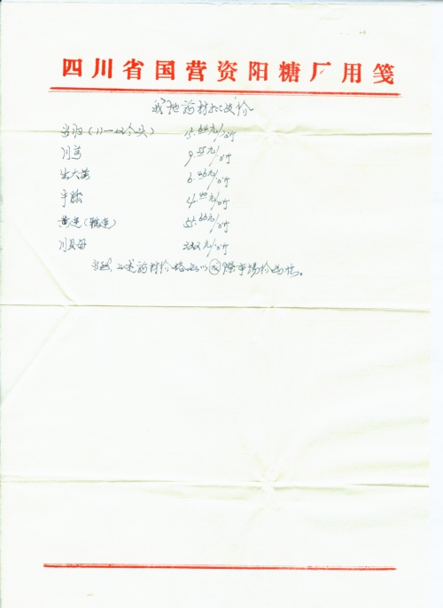 我父亲胡荣森(学名胡必光)曾长期经营批量中药材,在“源远长中药行栈”时(重庆市储奇门三牌坊原临江小学斜对面外),与袁恕成等人合伙经营当归、川芎等批量中药。父股份与该“行栈”的40%以上,成为“行栈”老板。当时,在重庆市中药市场上,除“祥源行栈”中药储备最多之外,其次要数我父的中药储备量。在那段时日里,“祥源”和我父的中药当归,基本上充裕重庆市场。在此期间,父胡荣森又在菜园埧上面的篼子背处(即原重庆菜园埧火车站上行火车经过的第一个隧道旁),租了仓房。一来为了疏散“源远长”属我父所有的药材,二来为了单独扩拓业务。一九四〇年夏,日本飞机轰炸重庆,父篼子仓储被轰烧一空,房、药毁于一旦,致使我父濒临破产边沿。事后,父亲向我叙述(当时我20来岁,长子,在国民政府盐务局硝磺处工作。次子胡忠智,三字胡忠仪,女胡忠信均在读书),轰烧损毁药材:当归(碧口产11-12个头)370多包(每包净重150斤,折合按370×150=55500斤=27750公斤=27.75吨),川芎120多包(每包净重150斤,按120×150=18000斤=9000公斤=9吨)。生大黄160多包(每包净重150斤,按160×150=24000斤=12000公斤=12吨),牛膝80多包捆(每捆110-120斤,按115×80=9200斤=4600公斤=4.6吨),黄连(雅连)1500多斤,川贝母300余斤。