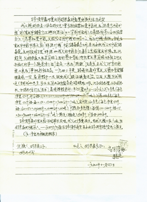 虽然抗日战争已事过近五十来年,我中国民众要求日本国谢罪,赔偿损失是完全应该而且必要的。此次见报喜悉先生为中国受害民众向日本国要求索赔之举,赞敬不已。为此,我们兄姐弟也请求您给予申报登记,要日本国谢罪,对我父所遭损失索赔。现附上一份我长兄胡镇西病床口述,本人作记的材料给先生,拜托办理,望其指教。后谢。