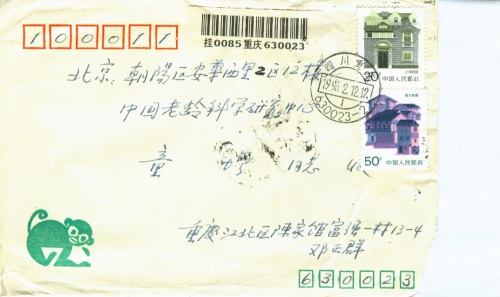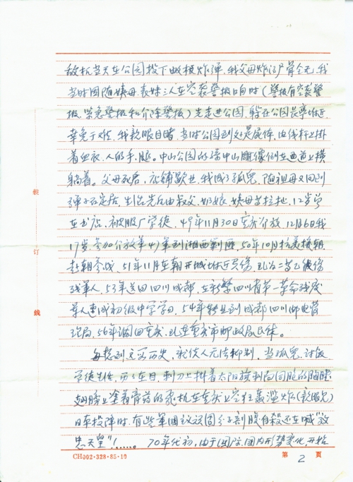 I don’t want to say much before getting contact with you. I already have so many thoughts when writing this letter. The following is a brief description of my story. I was born at Beipingxiang, Danzishi, Nan’an, Chongqing in July 1932. My parents once opened a restaurant near Zhongshan Park (now People’s Park) near Xinhua Road (Daliangzi) and Changping Street (now Zhourong Road), Shangbancheng, downtown Chongqing. After the outbreak of the anti-Japanese war, a large number of migrants (people escaping from other provinces to Sichuan) came to Chongqing. My parents began to sell pancakes, fritters, soy milk, steamed dumplings, etc. On May 3, 1939, Japanese planes bombed Chongqing. As my parents spent time closing the store, they didn’t have enough time to hide in the dugout near the park when the air raid alert rang, so they had to hide under a tree. The Japanese planes dropped several bombs at the park that day; I couldn’t even find my parents’ corpses. When the air raid alert (there were the air raid alert, emergency alert and all clear alert) rang, my aunt, cousin and I entered the park, hid near the corridor and survived. I saw with my own eyes many dead bodies or body parts in the park and the Sun Yat-sen Statue fell down and lied on the passage. After my parents died, our restaurant was closed and I became an orphan. I returned to Danzishi with my grandmother and was raised up by my uncle, wet nurse and aunt. When I was 12, I worked as an apprentice in a bookstore and clothing factory. Chongqing was liberated on November 30, 1949. On December 6, 17-year-old me joined the No. 47 People’s Liberation Army to eliminate bandits in Western Hu’nan. In October 1950, I went to Korea to resist U.S. aggression. In November 1951, I got injured near Kaesong (I am now a second-level Class B disabled veteran). I returned to Chengdu, Sichuan in 1953, where I studied at the First Quick Junior High School for Revolutionary Disabled Soldiers. In 1954, I was transferred to work with the Posts and Telecommunications Administration of Chengdu. In 1956, I was transferred back to Chongqing and now I am a retired employee from the Chongqing Post Office.