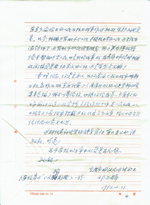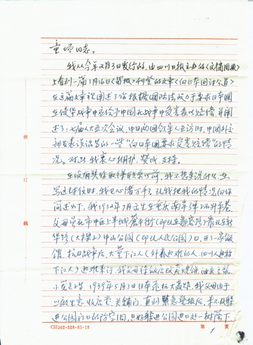 Comrade Tong Zeng, you are from Chongqing yourself. If you need the material “Records on the Mountain City of Chongqing Being Bombed by Japanese Planes During the Anti-Japanese War” (Edited by the Cultural and Historical Data Research Council, CPPCC, Nanning), I can send it to you. I also ask you to send me some materials about Pursuing Justice Against Japan, including your article Revelation reprinted by dozens of publishing houses such as People’s Daily, Worker’s Daily and your opinion letter to the Letters and Visits Bureau of the National People’s Congress General Office.