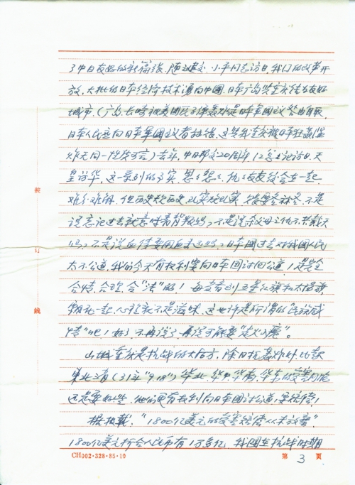 Whenever I recall these memories, I couldn’t help but feel sad. The memories of being an orphan, begging for food and working as an apprentice came back to me. The Japanese soldiers used bayonets hung with Japanese sun flag to stab our compatriots and Japanese planes with plastered wings flew over the sky to bomb Chongqing. (I witnessed) When Japan surrendered some militarists cut open their bellies, shouting “allegiance to the emperor!”. In early 1970, China and Japan established a friendship due to the changes of the international and domestic circumstances. Then, Comrade Deng Xiaoping visited Japan and implemented the opening-up policy. Numerous Japanese technologies were introduced in China and Hiroshima, Japan became a sister city of Chongqing. (Hiroshima and Nagasaki were bombed by the U.S. because they deserved it. The Japanese people should get even with Japanese militarists. This is different from Chongqing being bombed by Japan) Last year was the 20th anniversary of the establishment of diplomatic relations between China and Japan. General Secretary Jiang visited Japan and the Japanese Emperor visited China. The current and past events are mixed up, but history is one thing and reality is another. Don’t we say that it is betrayal to forget the past? Don’t we say that we have a profound hatred of whoever killed our parents? Don’t we say that a blood debt must be paid with blood? Japan did injustice to Chinese people in the past. We today have the right to pursue justice against Japan. It is totally reasonable and legal. I feel uncomfortable whenever I see our Five-Starred Red Flag flying with the Japanese Sun Flag. Maybe this is what’s called “national feelings”. Ok, I’ll stop here, otherwise I may get mad.