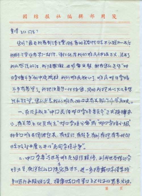 最近我看到了李正堂同志著的《为什么日本不认账》一出后我给李正堂作者写了一封信,谢谢他为我们难民伸张正义,说出了我们想说的话,我很感激,也非常[欣]慰,能有您们这些“对日索赔斗争”的中流砥柱。我们难民放心了,难民对日索赔斗争有希望了。我把信复写一份给您,同时我提出以下几点想法和愿望,您们代表我们难民向中央有关部门作些反映。