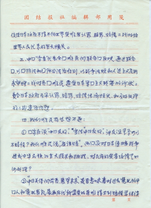 三、中国“索委”代表全国难民向联合国反映,通过联合国,以国际法和国际公法为准则,以战争法规和人道主义原则来审理二战时各国难民遭受日本军国主义残害的诉状。责令日本政府及早认罪,赔罪,赔偿经济损失,和及时处理好二战遗留问题。
