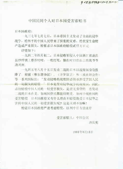 一九三七年七月七日,日本帝国主义发动了全面的侵华战争,给和平的中国人民带来了深重的灾难,给我家生命财产造成严重损失,特要求日本国政府赔偿贰仟万日元。
