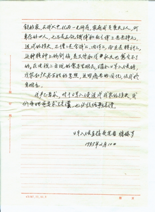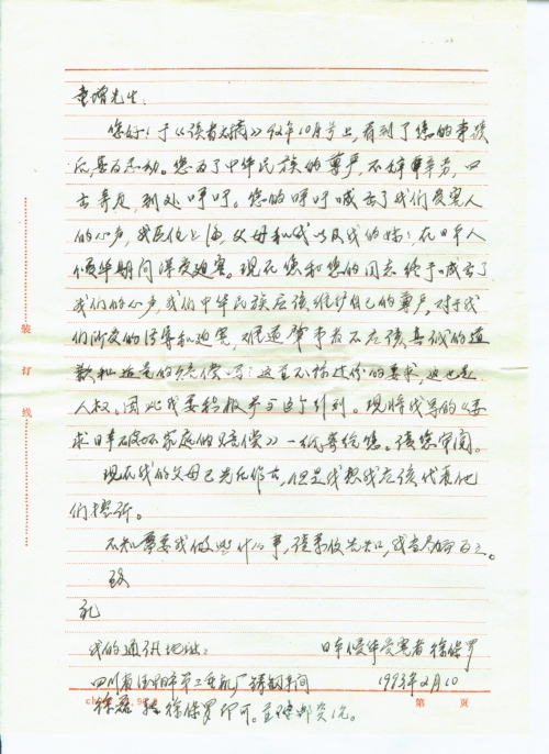I am very touched by your acts reported in Reader’s Digest of October 92. You’ve so worked hard for the dignity of Chinese people. You’ve spoken out what’s in the mind of victims like me. I originally lived in Shanghai, with my parent and my sister and suffered tremendously during the Japanese invasion. You and your team finally give our voice and our heart an opportunity to be heard. Chinese people’s dignity must be protected and respected. Shouldn’t the criminals make a sincere apology and proper compensation for the insult and torture we’d suffered? This should not an excessive request, but part of human rights. Therefore, I decide to actively participate in the program and the team. Now I am sending you my article Demanding Compensation Against Japan for Destroying My Family for your review.