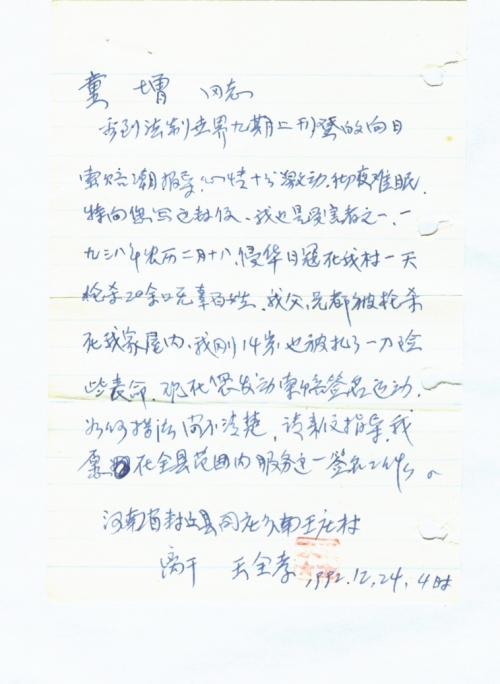 看到《法制世界》九期上刊登的向日索赔潮报导,心情十分激动,彻夜难眠。特向您写这封信。我也是受害者之一,一九三八年农历二月十八,侵华日寇在我村一天枪杀20余口无辜百姓,我父、兄都被枪杀死我家屋内,我刚14岁,也被扎了一刀险些丧命。现在您发动索赔签名运动,如何搞法尚不清楚,请来信指导。我愿在全县范围内服务这一签名工作。