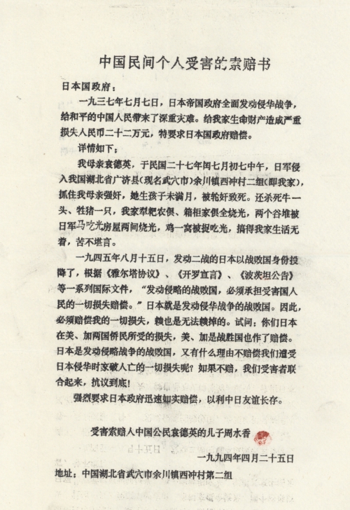 一九四五年八月十五日,发动二战的日本以战败国身份投降了,根据《雅尔塔协议》、《开罗宣言》、《波茨坦公告》等一系列国际文件,“发动侵略的战败国,必须承担受害国人民的一切损失赔偿。”日本就是发动侵华战争的战败国。因此,必须赔偿我的一切损失,赖也是无法赖掉的。试问:你们日本在美、加两国侨民所受的损失,美、加是战胜国也作了赔偿。日本是发动侵略战争的战败国,又有什么理由不赔偿我们遭受日本侵华时家破人亡的一切损失呢?如果不赔,我们受害者联合起来,抗议到底!