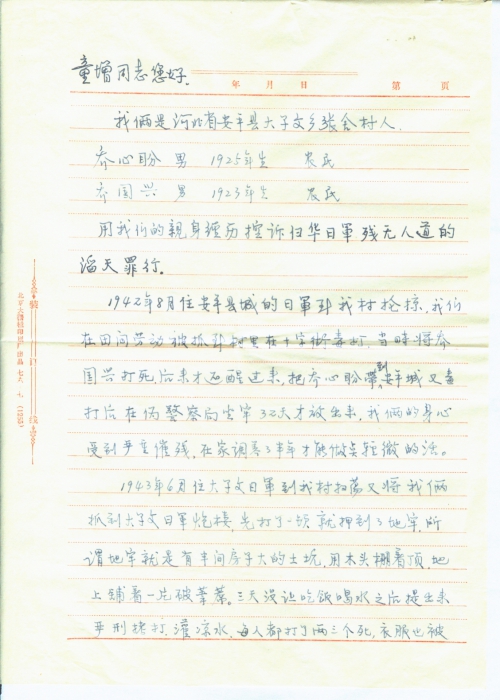1942年8月住安平县城的日军到我村抢掠,我们在田间劳动被抓到村里,在十字街毒打。当时将乔国兴打死,后来才还醒过来,把乔心盼带到安平城又毒打后,在伪警察局坐牢32天才放出来,我们俩的身心受到严重摧残,在家调养了半年,才能做点轻微的活。
