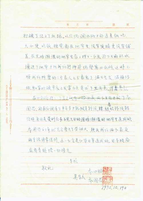 在四分所押了一个月才放乔心盼回家,两个月后才放了乔国兴。回家调养了半年多才能做点轻活,腰、腿痛始终没能治好,原因是受刑后在不见天日的阴暗潮湿的地牢里造成的。乔国兴63年就完全丧失了劳动力。殃及我们两个家庭的生活非常凄惨。这一切全是侵华日军造成的,日本政府应负责赔偿一切损失。