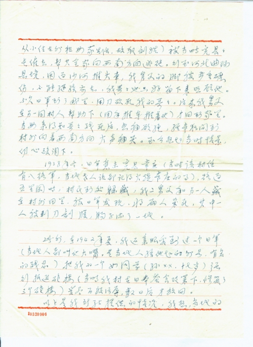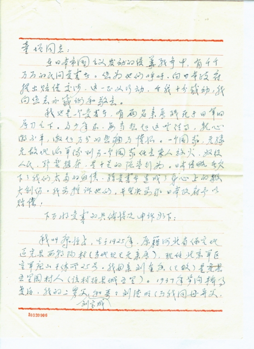 我也是一个受害者,有两名亲属残死于日军的屠刀之下。多少年来,每当想起这些往事,就心情不平,激起万分的悲痛与愤恨。一个国家,无缘无故地派军队到另一个国家任意杀人放火,奴役人民,野蛮掠夺,是十足的强盗行为。日本侵略者欠下了我们太多的血债,给受害者造成了身心上的极大创伤。我要控诉他们,并坚决要求日本政府予以赔偿!