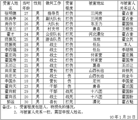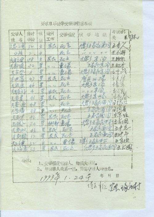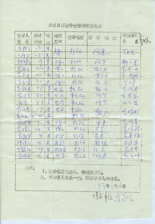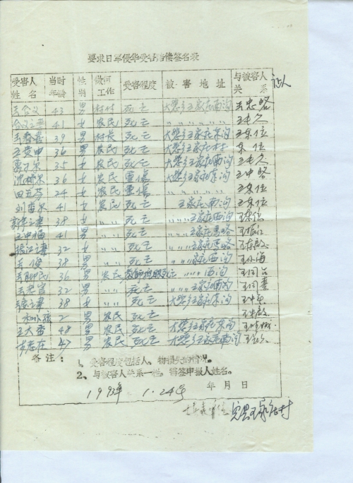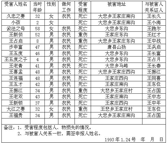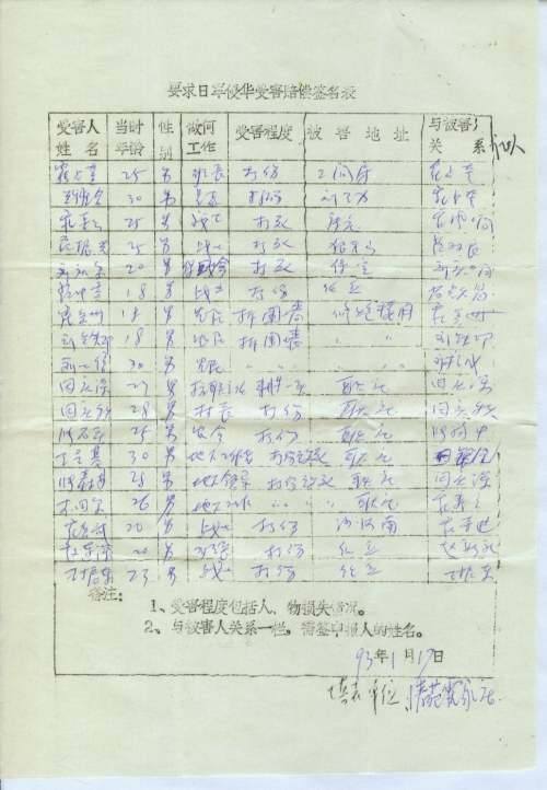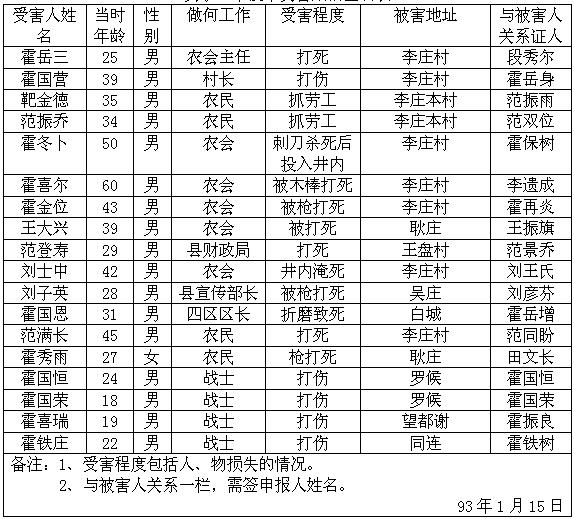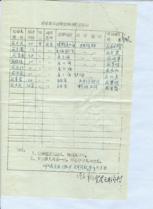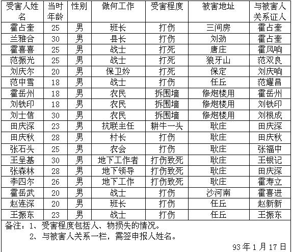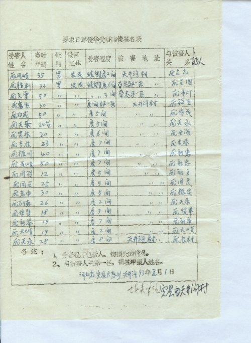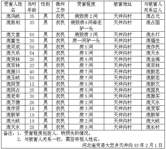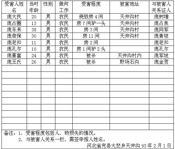 细节:寄来河北省大悲乡的受害情况的签名表,其中有郭运等被杀害的,有财产损失–房屋被烧毁,田庆秋等人被打伤。
