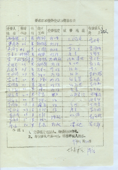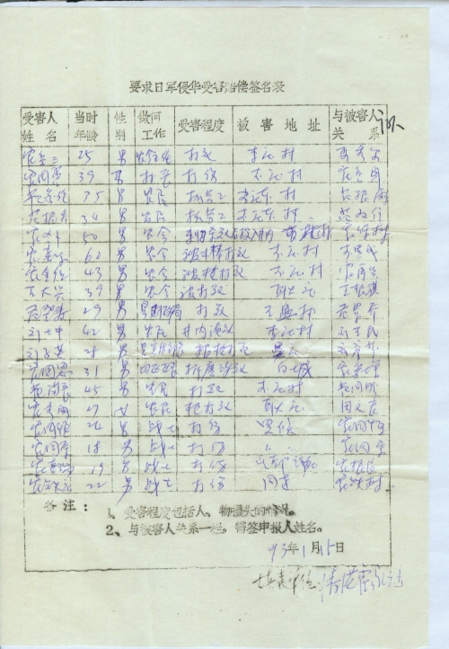 感谢您在百忙中给我复信,对于您能首先站出来提出向日本国要求受害赔偿,代表了亿万中国人民的心声,对于您这种大无畏的革命精神,深感钦佩,愿全力支援。我已按您的意图收集了部分受害者亲属签名,现寄去,不知还需要作些什么。您在91年4月向全国人大代表提出受害赔偿,为国为民是件天大的好事。日本已是个经济强国,我们国家还较穷,并且又符合国际法原则,为何不向日本国索要呢。我是个一般干部和千万老百姓一样心有余而力不足,不知道采用什么办法才能实现这一愿望。