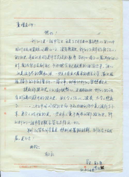 提起那段历史,人们都很伤心,正因为如此,我们的话有时竭力避开那段历史,因太令人伤心、沮丧、太令人悲哀了……。二千万中国同胞的生命,不知为他们多少亲人造成了不幸,更令人吃惊的是,一些日本人竟不承认那段历史,所以我们一组中学生联合签名支持这一切。