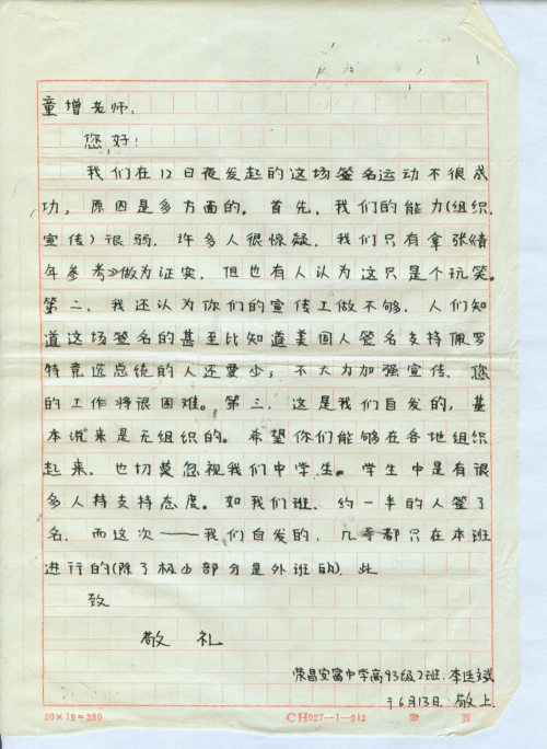 我们在12日夜发起的这场签名运动不很成功,原因是多方面的。首先,我们的能力(组织宣传)很弱。许多人很惊疑,我们只有拿张《青年参考》做为证实,但也有人认为这只是个玩笑。第二,我还以为你们的宣传工[作]不够,人们知道这场签名的甚至比知道美国人签名支持佩罗特竞选总统的人还要少,不大力加强宣传,您的工作将很困难。第三,这是我们自发的,基本说来是无组织的。希望你们能够在各地组织起来,也切莫忽视我们中学生,学生中是有很多人支持态度。如我们班,约一半的人签了名,而这次——我们自发的,几乎都只在本班进行的(除了极少部分是外班的)此