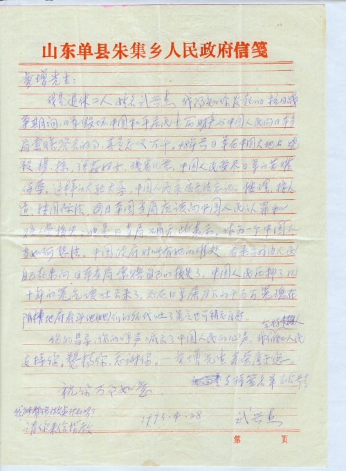 我是退休工人,姓名武兴杰。我得知你发起的抗日战争期间,日军毁坏中国和平居民生命财产与中国人民向日本当局索赔签名的事,真是感叹万千。48年前日军在中国大地上烧、杀、掳、掠,强奸妇女,残害儿童,中国人民受尽日军的苦难侮辱。这样的大耻大辱,中国人民永远无法忘记。按理,按人道,按国际法,日本国当局应该向中国人民认罪和赔偿损失,但是日当局确无此表示。作为一个中国人当如何想法。中国政府对此有她的难处,看来只好由人民自己起来向日本当局索赔自己的损失了。中国人民压抑了几十年的冤气该吐出来了,死在日军屠刀下的千百万冤魂在阴槽地府看到他(她)们的后代吐了冤气也可稍感自慰。