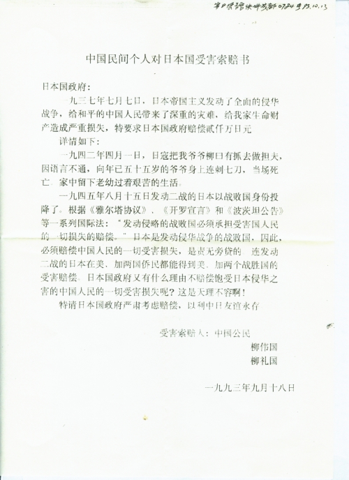 一九三七年七月七日,日本帝国主义发动了全面的侵华战争,给和平的中国人民带了深重的灾难,给我家生命财产造成严重损失,特要求日本国政府赔偿贰仟万日元