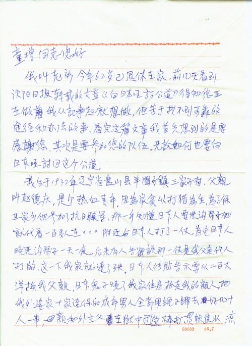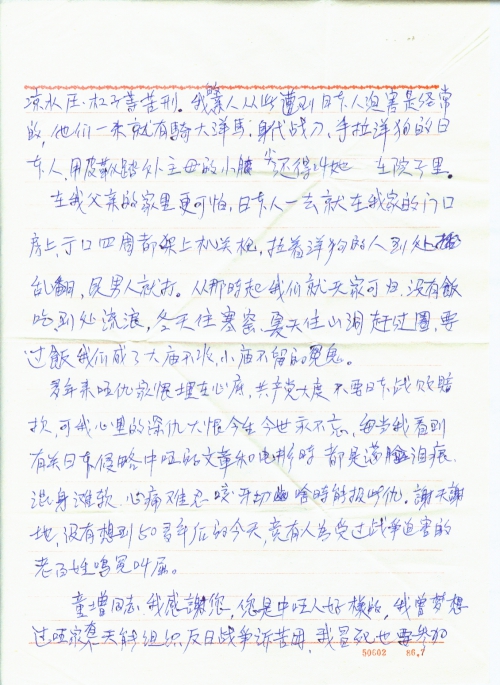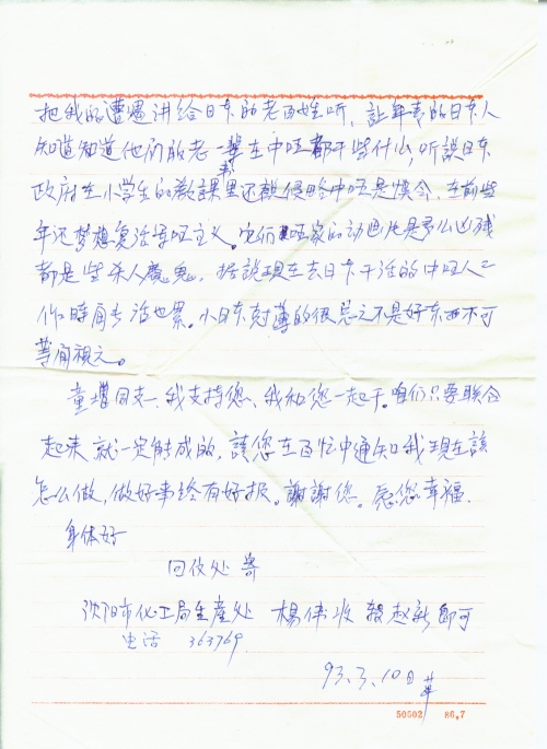 童增同志,我感谢您,您是中国人好样的,我曾梦想过国家有一天能组织反日战争诉苦团,我冒死也要参加把我的遭遇讲给日本的老百姓听,让年[轻]的日本人知道知道他们的老一辈在中国都干些什么,听说日本政府在小学生的教科书里还说侵略中国是误会,在前些年还梦想复活军国主义。[他]们国家的动画片是多么凶残都是些杀人魔鬼。据说现在去日本干活的中国人工作时间长,活也累。小日本[刻]薄的很,总之不是好东西不可等闲视之。