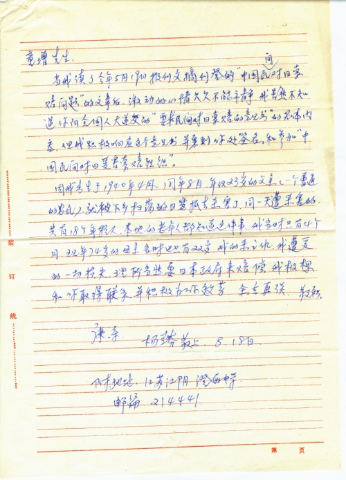 当我读了今年5月19日报刊文摘刊登的“中国民间对日索赔问题”的文章后,激动的心情久久不能平静,我虽然不知道你向全国人大递交的“要求民间对日索赔的意见书”的具体内容,但我积极响应这个意见书,并愿到你处签名,和参加“中国民间对日受害索赔组织”。