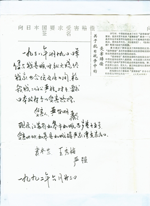 一九三八年三月十九日,日军侵占我县城时,纵火烧尽我家四合院瓦房七间,枪杀我二伯父严桂。对此,要求日本政府予以受害赔偿。