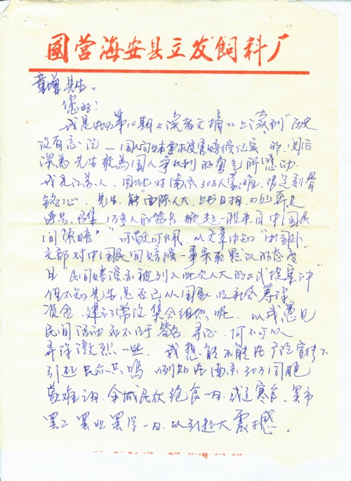 我是在92第10期《读者文摘》上读到“历史没有忘记——国人向日本要求受害赔偿纪实”的,阅后深为先生敢为国人争权利的勇气所感动。我是江苏人,因此对南京30万人蒙难,很是刻骨铭心。先生能“面陈人大、上书日相、四处奔走、呼号、召集1万多人的签名,掀起一股来自中国民间索赔”可敬可佩。从文章中知“中国外交部对中国民间赔偿一事采取默认的态度”,且“民间赔偿亦被列入此次人大的正式提案之中”,但不知先生是否已从国家及社会筹得资金,建立了常设集会组织呢?以我愚见,民间活动应不限于签名、寻证,何不可以弄得激烈一些,我想能不能在广泛宣传下,引起民众共鸣,例如在南京30万同胞蒙难之日,全城民众绝食一日,或者寒食、罢市、罢工、罢业、罢学一日,以引起大震撼。