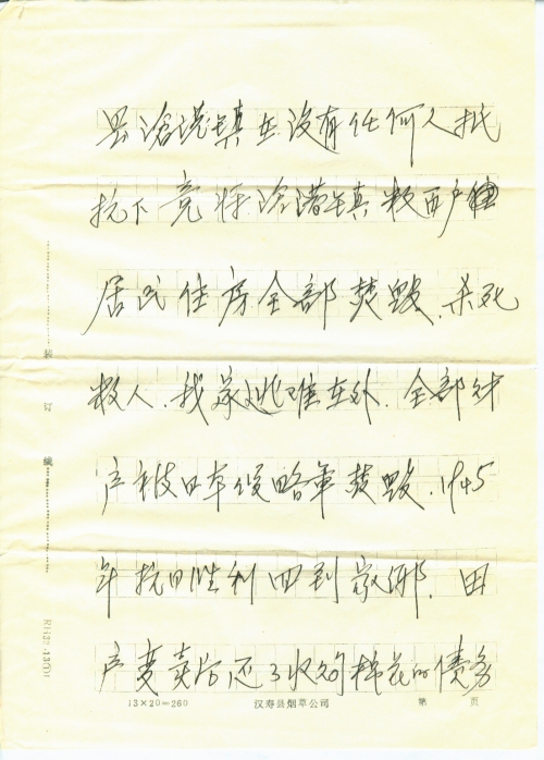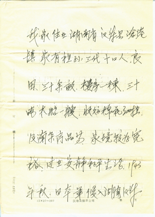 我家住在湖南省汉寿县沧港镇,家有祖孙三代十口人,良田三十余亩,楼房一栋,三十吨木船一艘,收购棉花300担及南杂商品等,家境较为宽裕,过在安静和平生活,1943年秋,日本军侵入湖南汉寿县沧港镇,在没有任何人抵抗下竟将沧港镇数百户居民住房全部焚毁,杀死数人,我家逃难在外,全部财产被日本侵略军焚毁。1945年抗日胜利回到家乡,田产变卖后,还了收购棉花的债务,我家由富裕家庭变为赤贫,子女失学,帮工影响了我们几代人们生活,对日本帝国侵略罪行,记忆犹新。