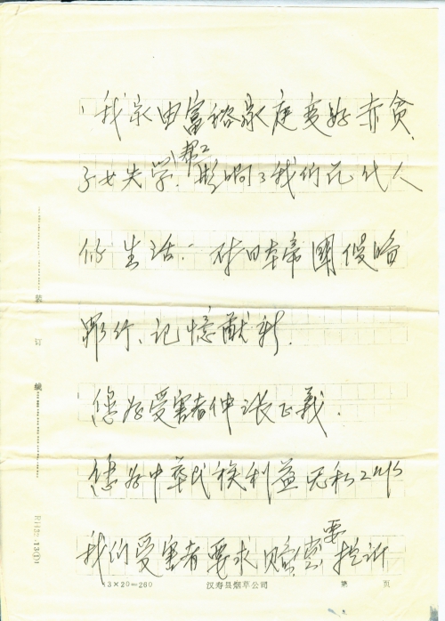 您为中华民族利益无私工作,我们受害者要求赔偿,要控诉日本帝国侵略罪行