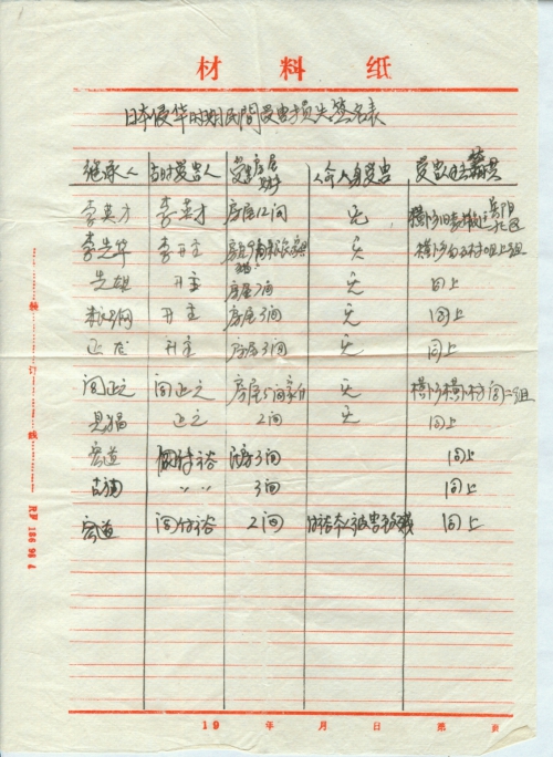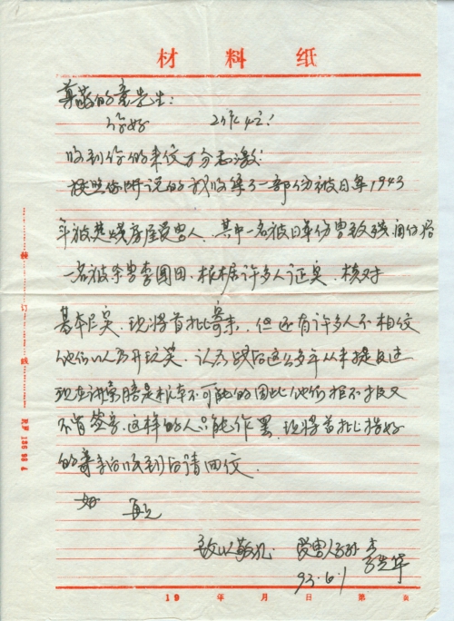 按照你所说的我收集了一部[分]被日军1943年被焚烧房屋受害人,其中一名被日军伤害致残,闾付俗一名被杀害李国田,根据许多人证实,核对,基本属实,现将首批寄来,但还有许多人不相信他们以为开玩笑,认为战后这么多年从未提及过,现在讲索赔是根本不可能的,因此他们拒不报又不肯签字,这样的人只能作罢,现将首批搞好的寄来后收到后请回信。