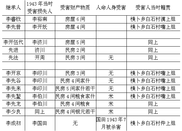 细节:李先华寄来他搜集到的受害者情况,并指出有些受害者认为索赔成功几率很小,就没有配合调查,他们不愿意提出索赔。寄来的索赔签名表中有李国田在1943年被杀害,闾付裕被害致残,李开妖等人家中房屋被烧毁。